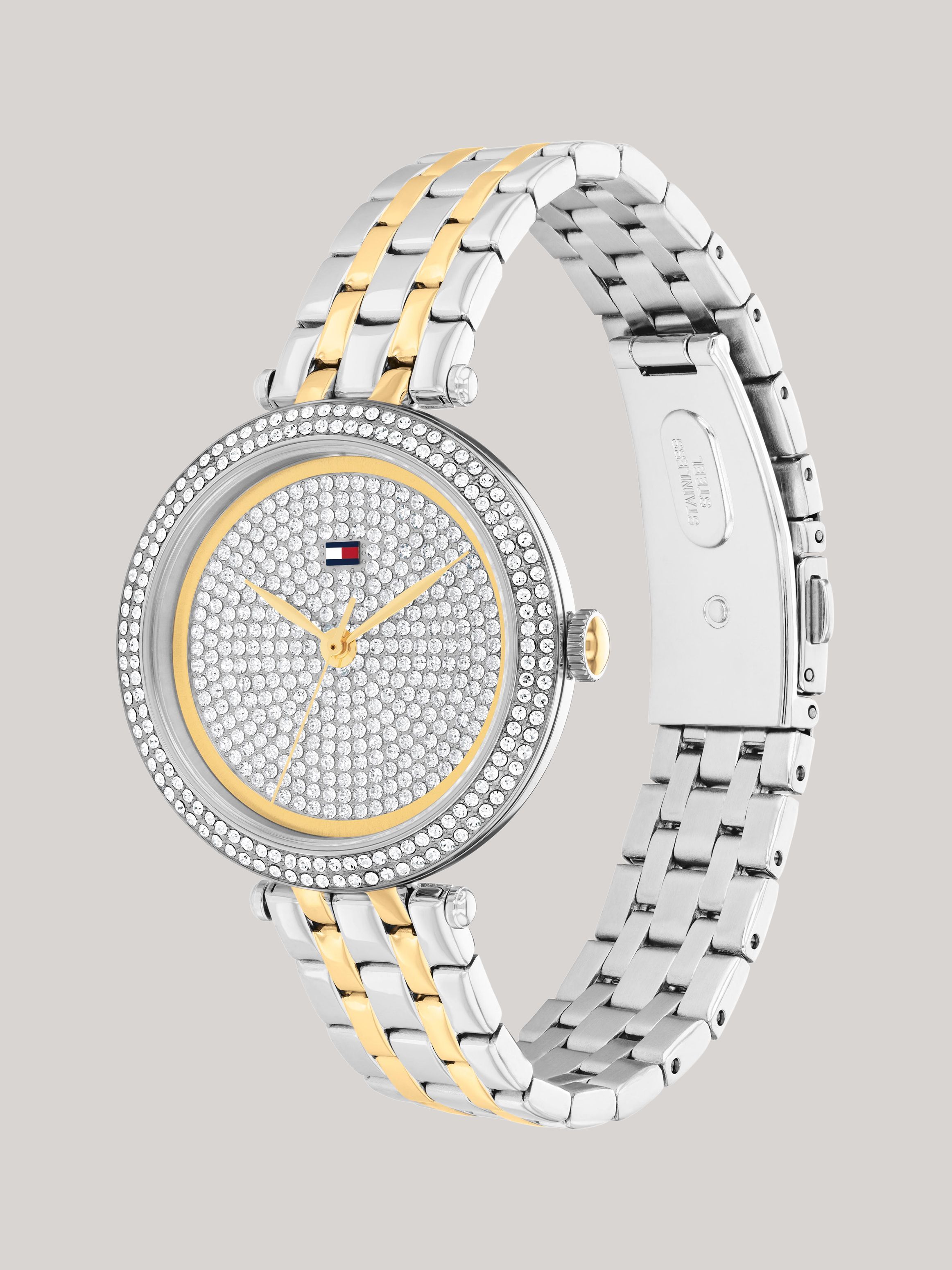 تضفي هذه الساعة لمسة أنثوية على تصميم السوار التقليدي، حيث تعرض واجهة كاملة مرصعة بالكريستال اللامع على القرص.