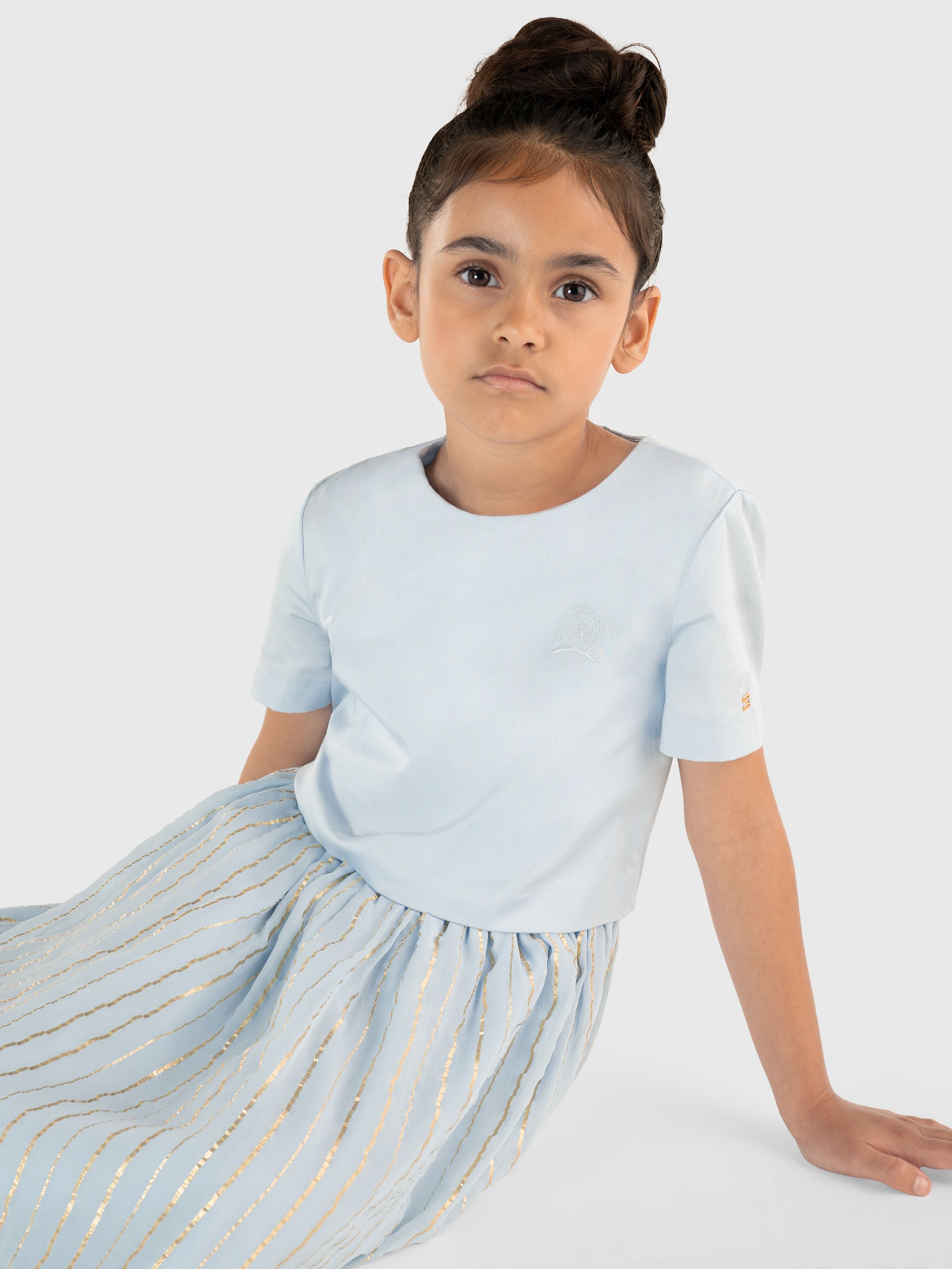 هذا الفستان الحريري مثالي للاحتفالات المميزة بفضل الحافة الأنيقة المتدرّجة بتفاصيل كشكشة مع لمعان الخطوط الميتاليك المنسوجة.