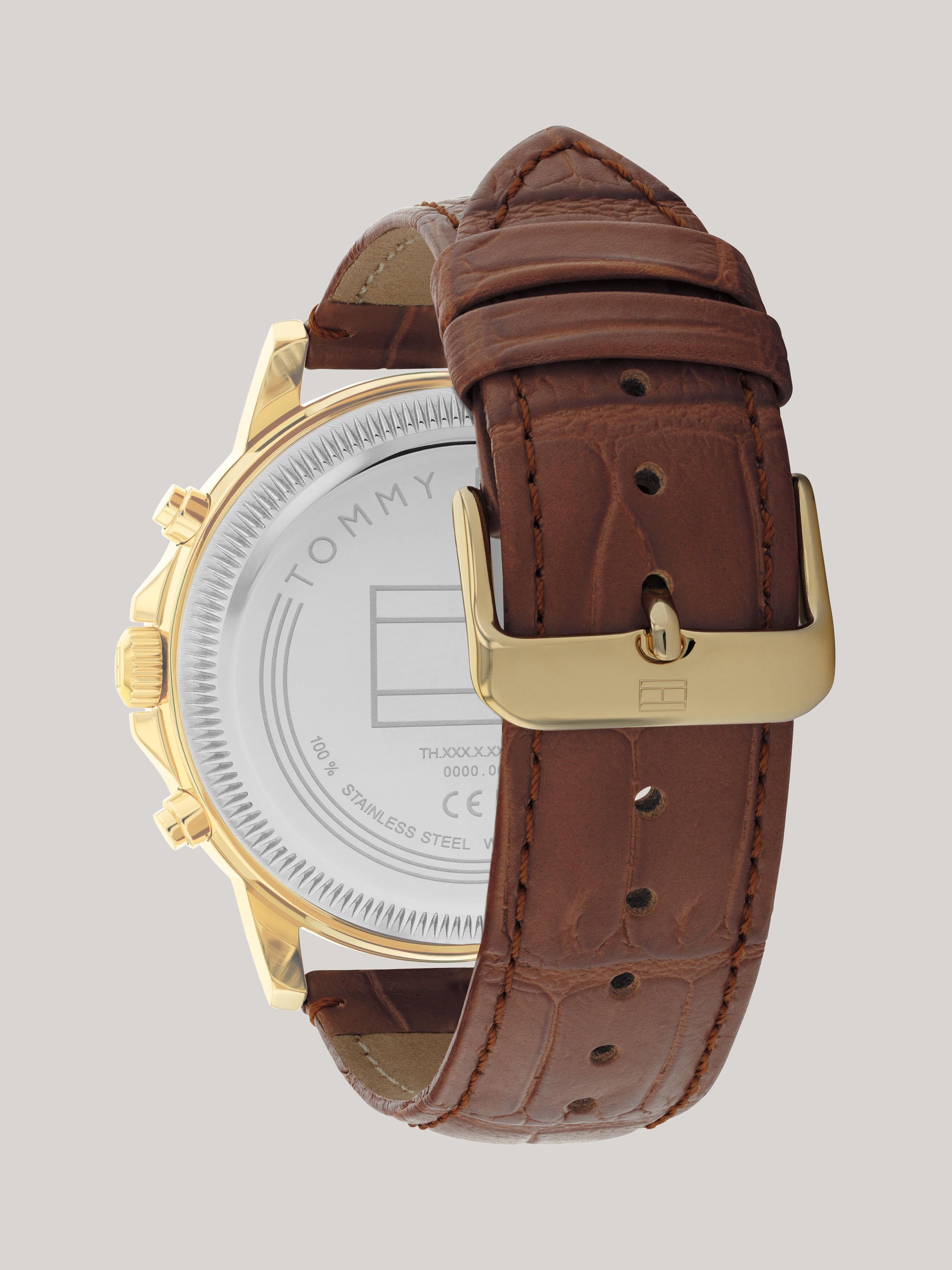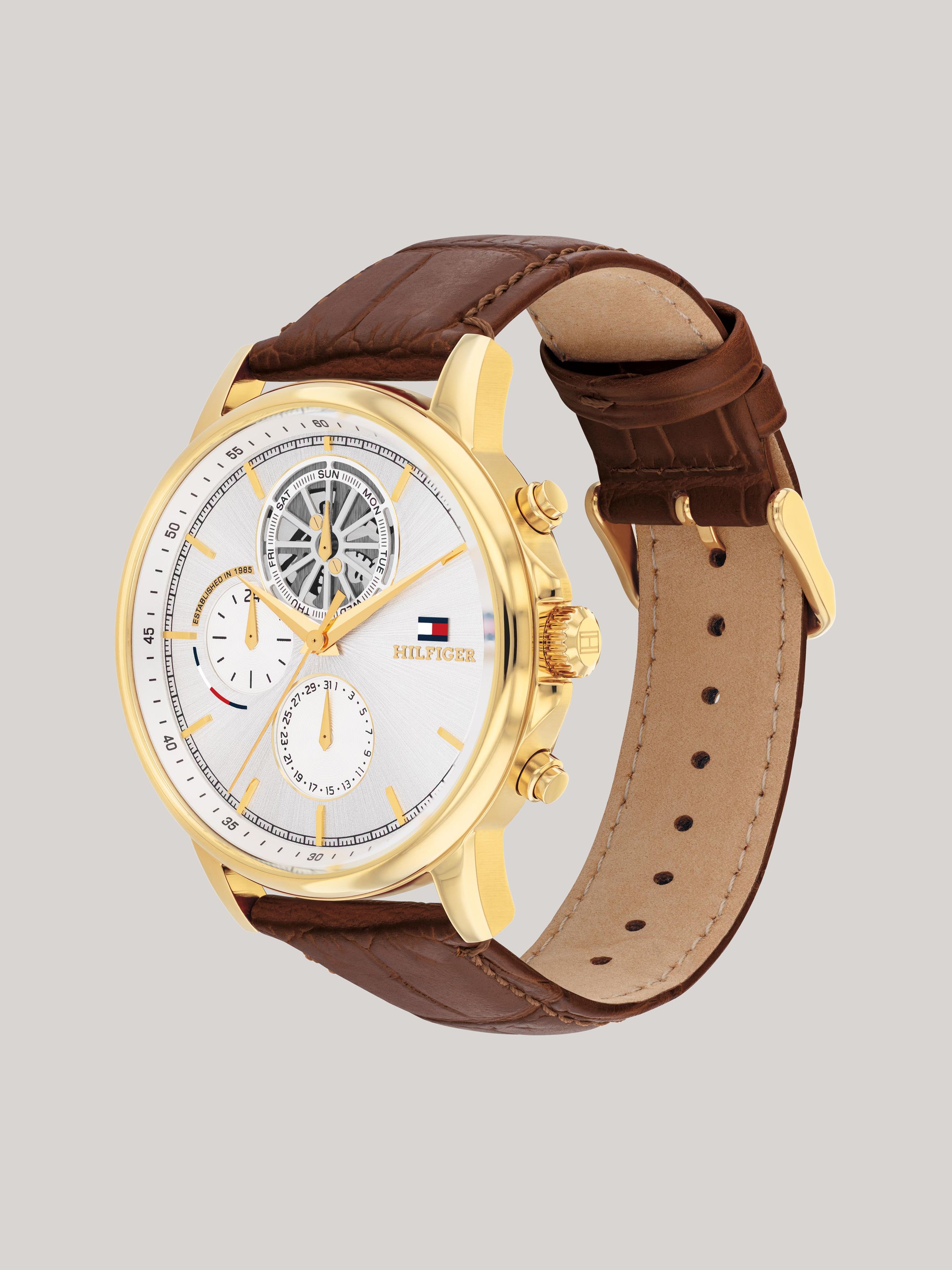 تتألق العناصر المطلية بالذهب في هذه الساعة على قرصها الفضي وحزامها المصنوع من الجلد البني، لتضفي مظهرًا ملفتًا.