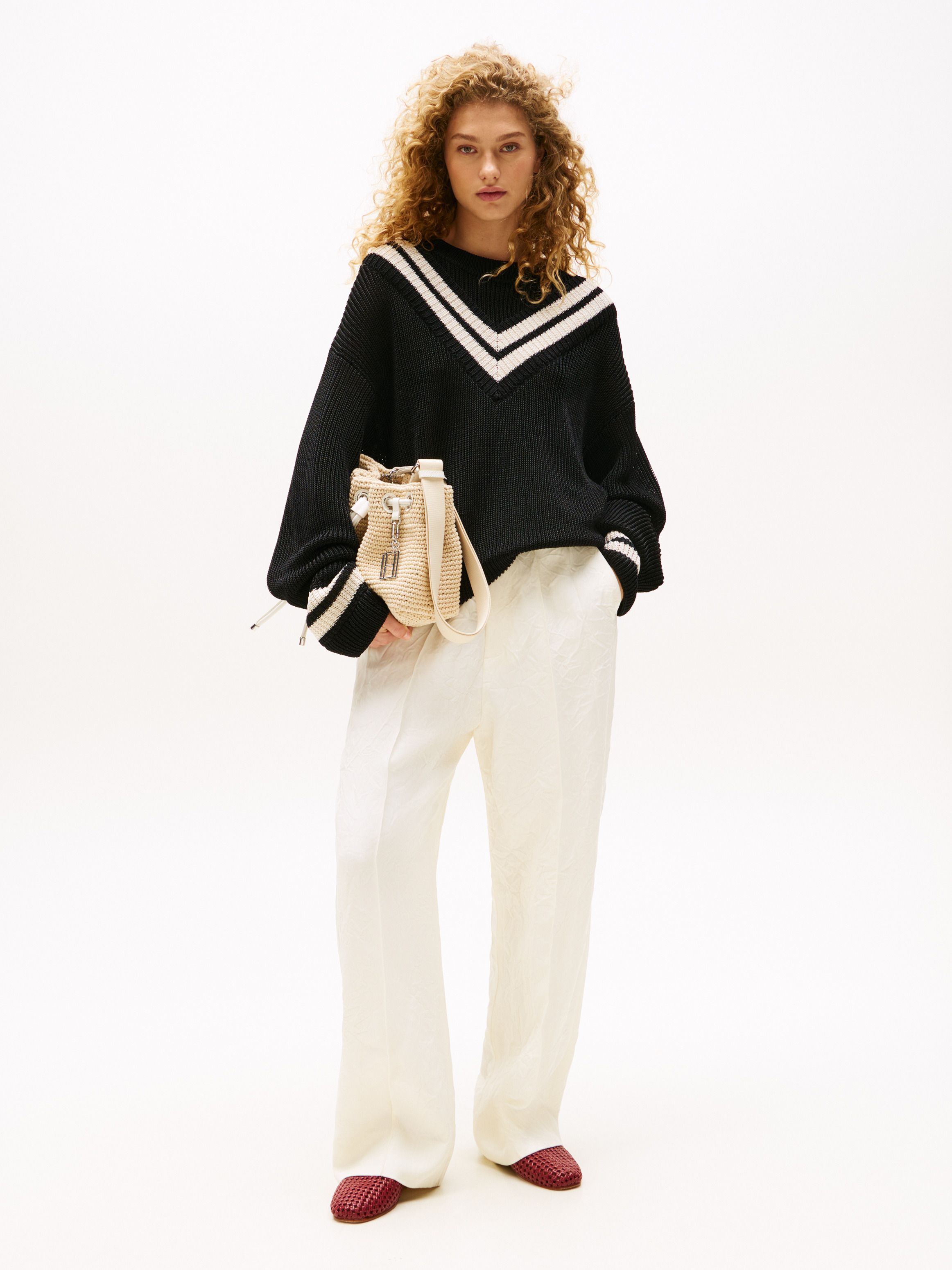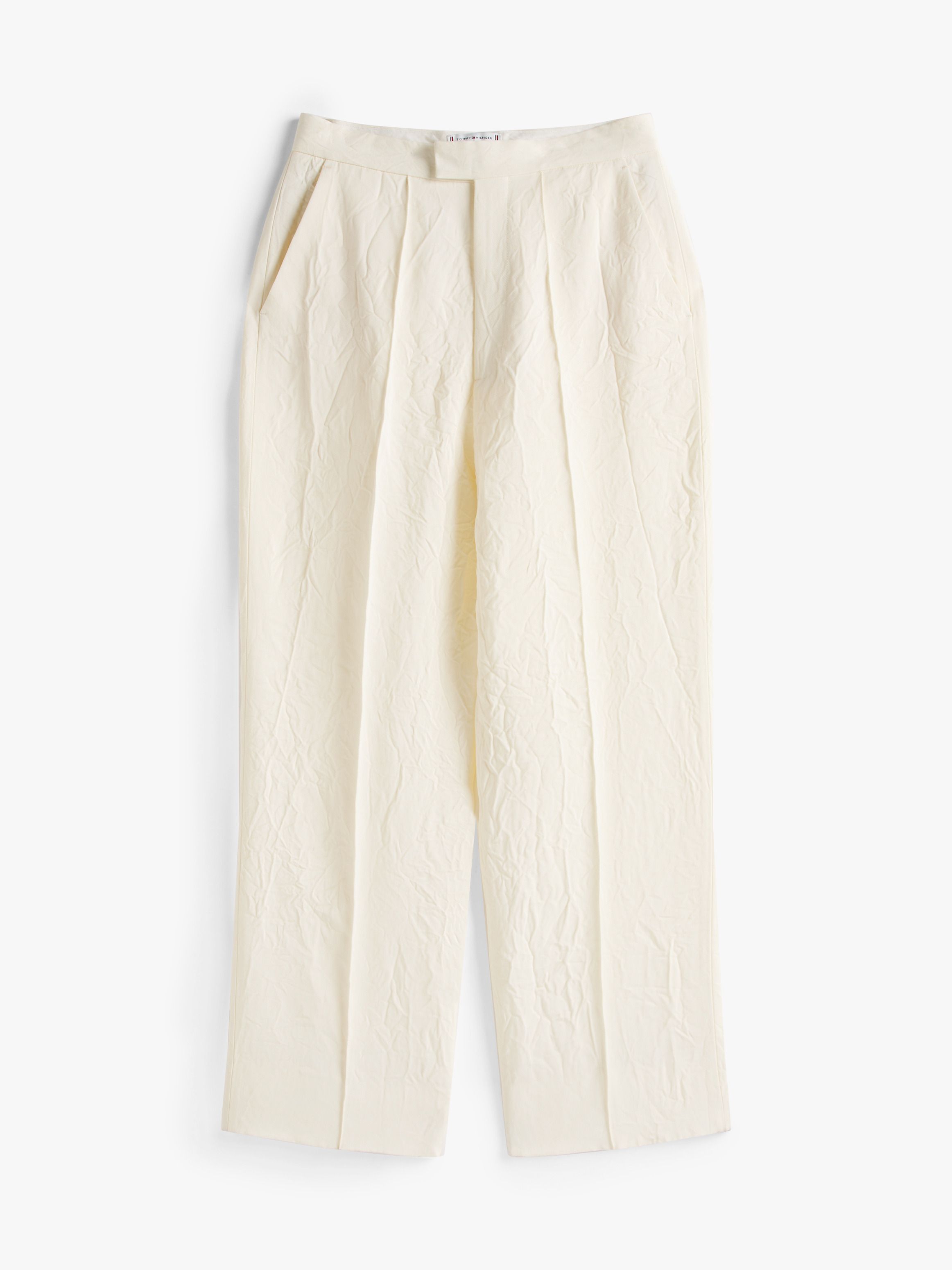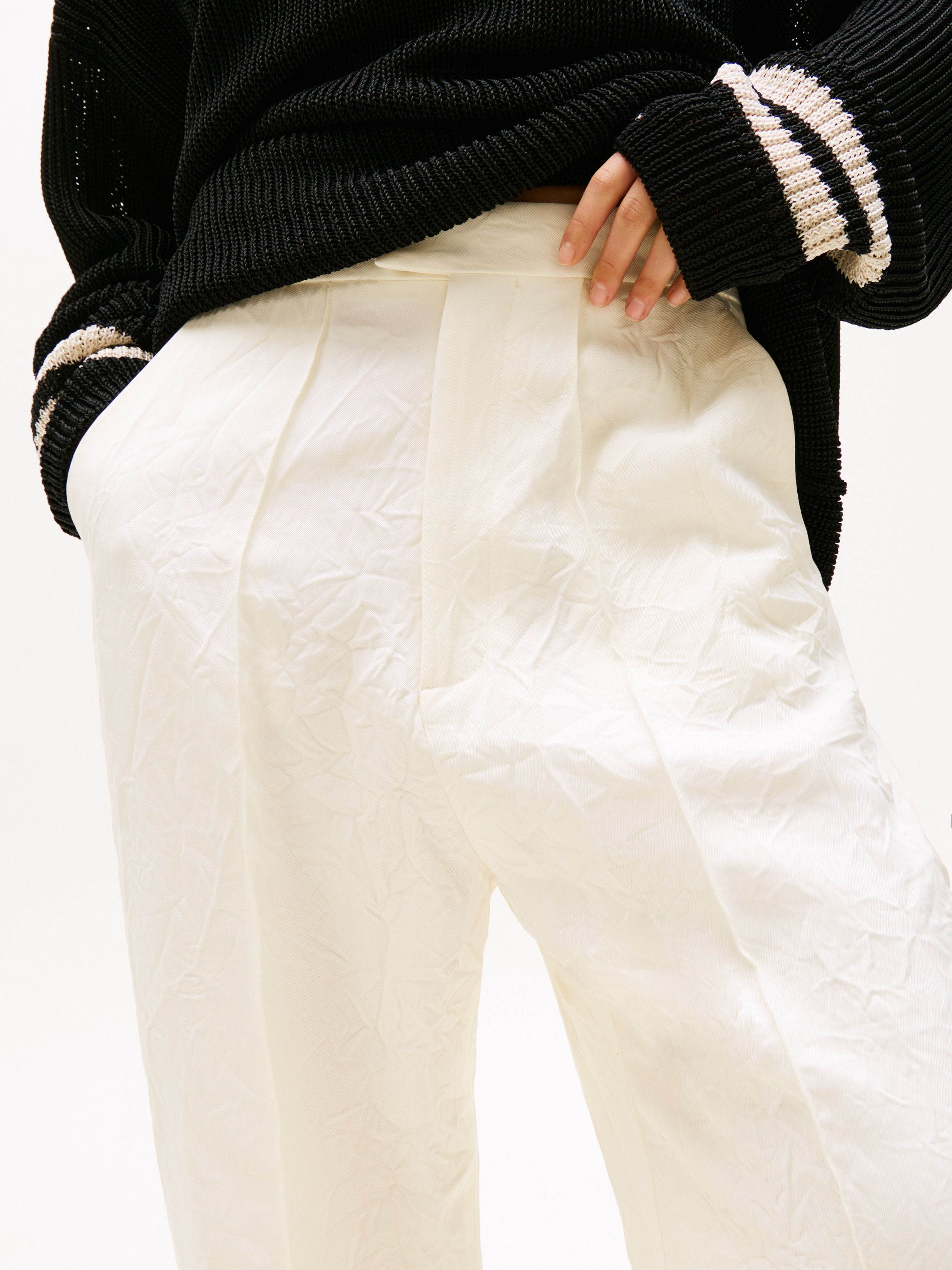 يمنحكِ هذا السروال المصمم بحواف حادة وأقدام واسعة مظهراً أنيقًا غير رسمي يتناسب تماماً مع الملابس المحاكة.
