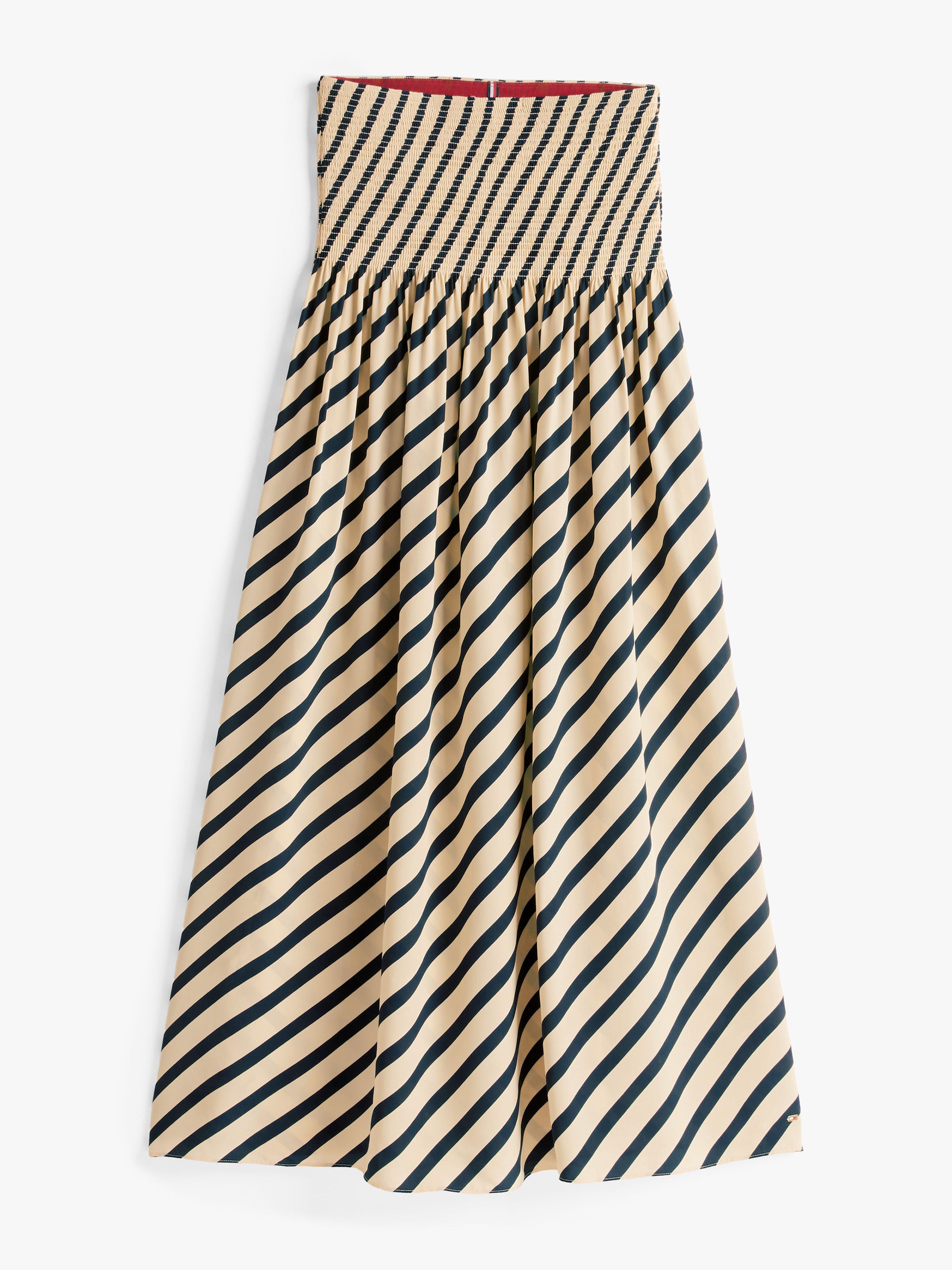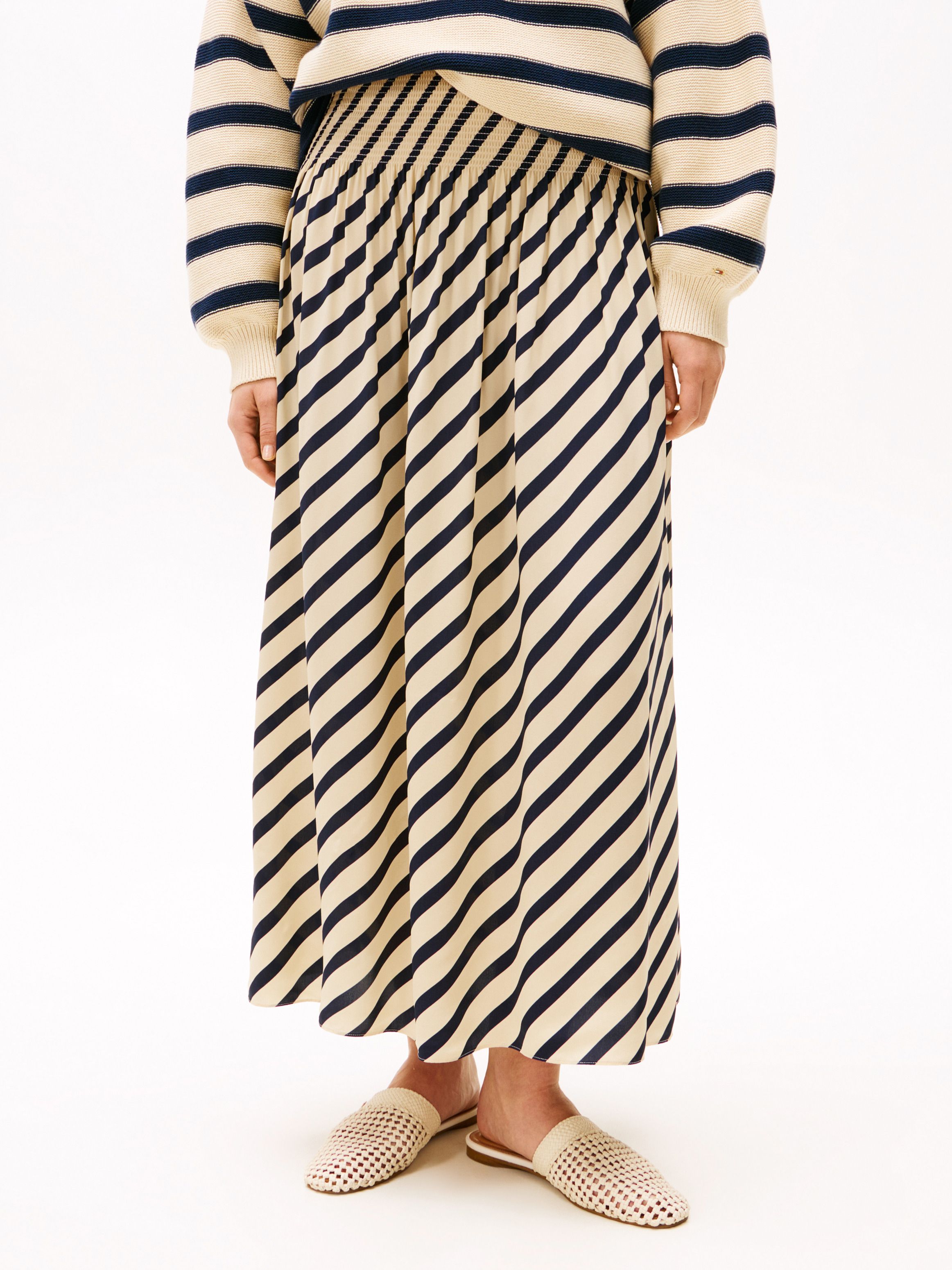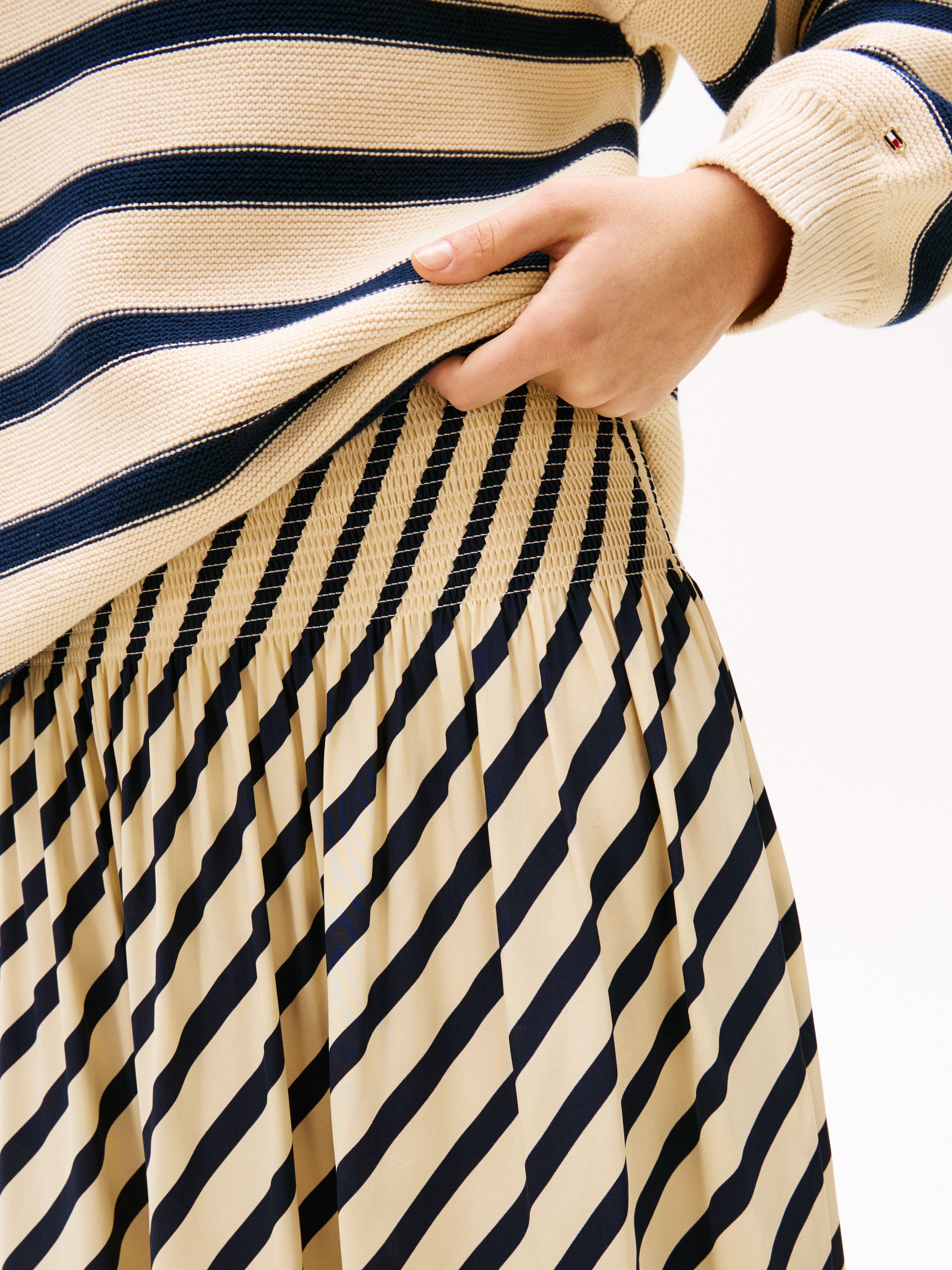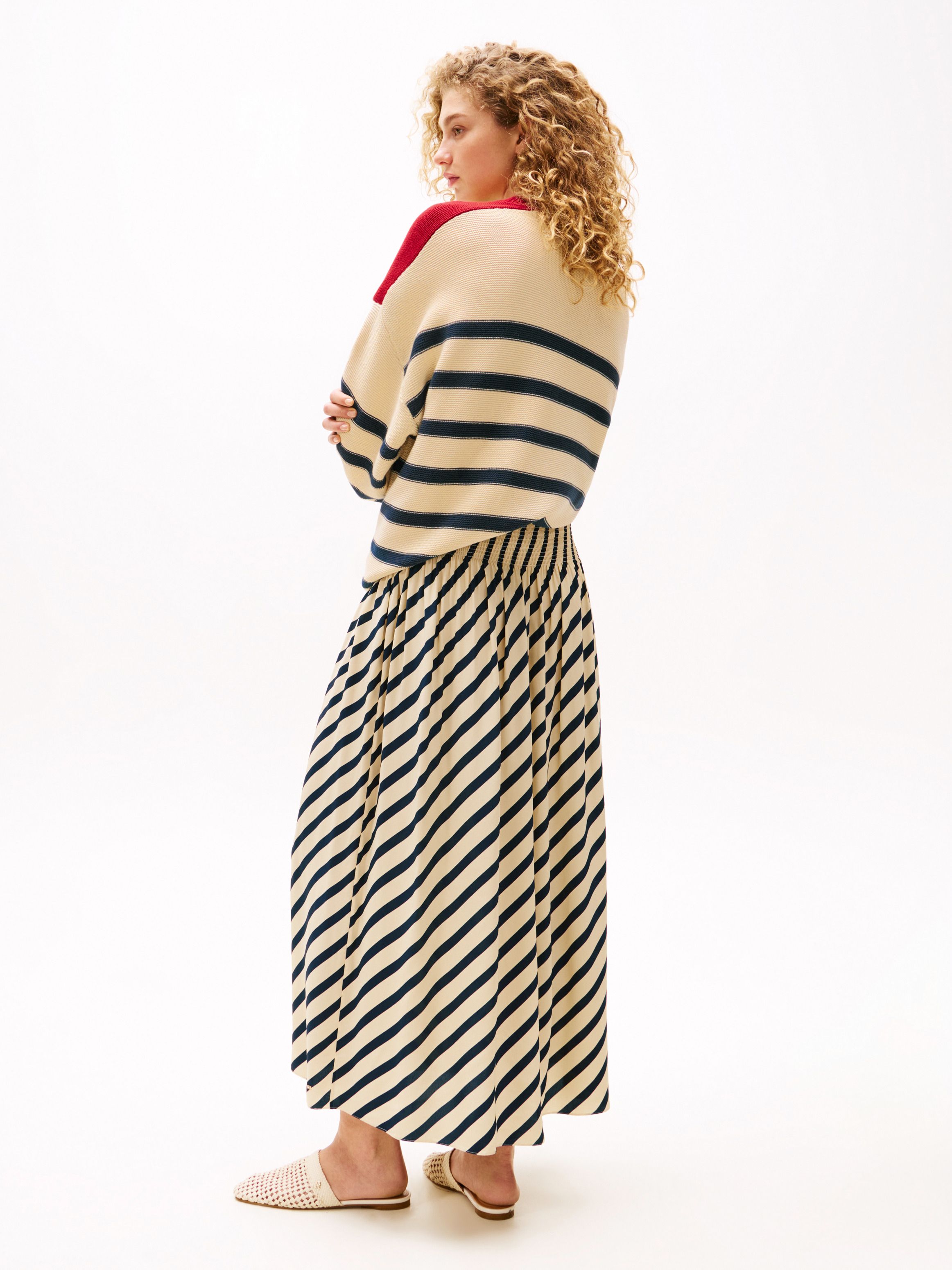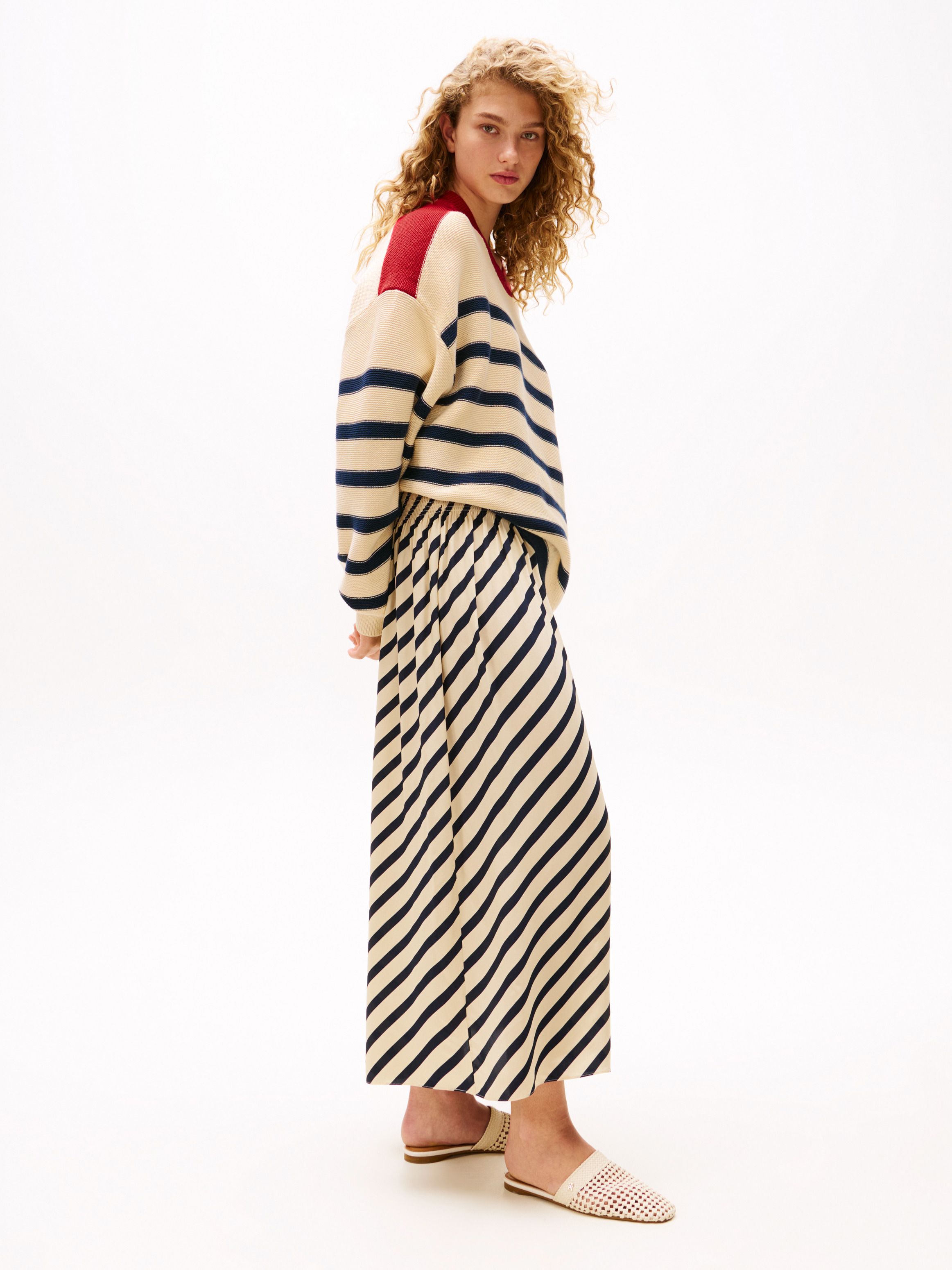 احصلي على إطلالة راقية مع هذه التنورة الماكسي المخططة بتصميم بريتون، والتي تتميز بثنيات تمنحها حركة انسيابية جذابة.