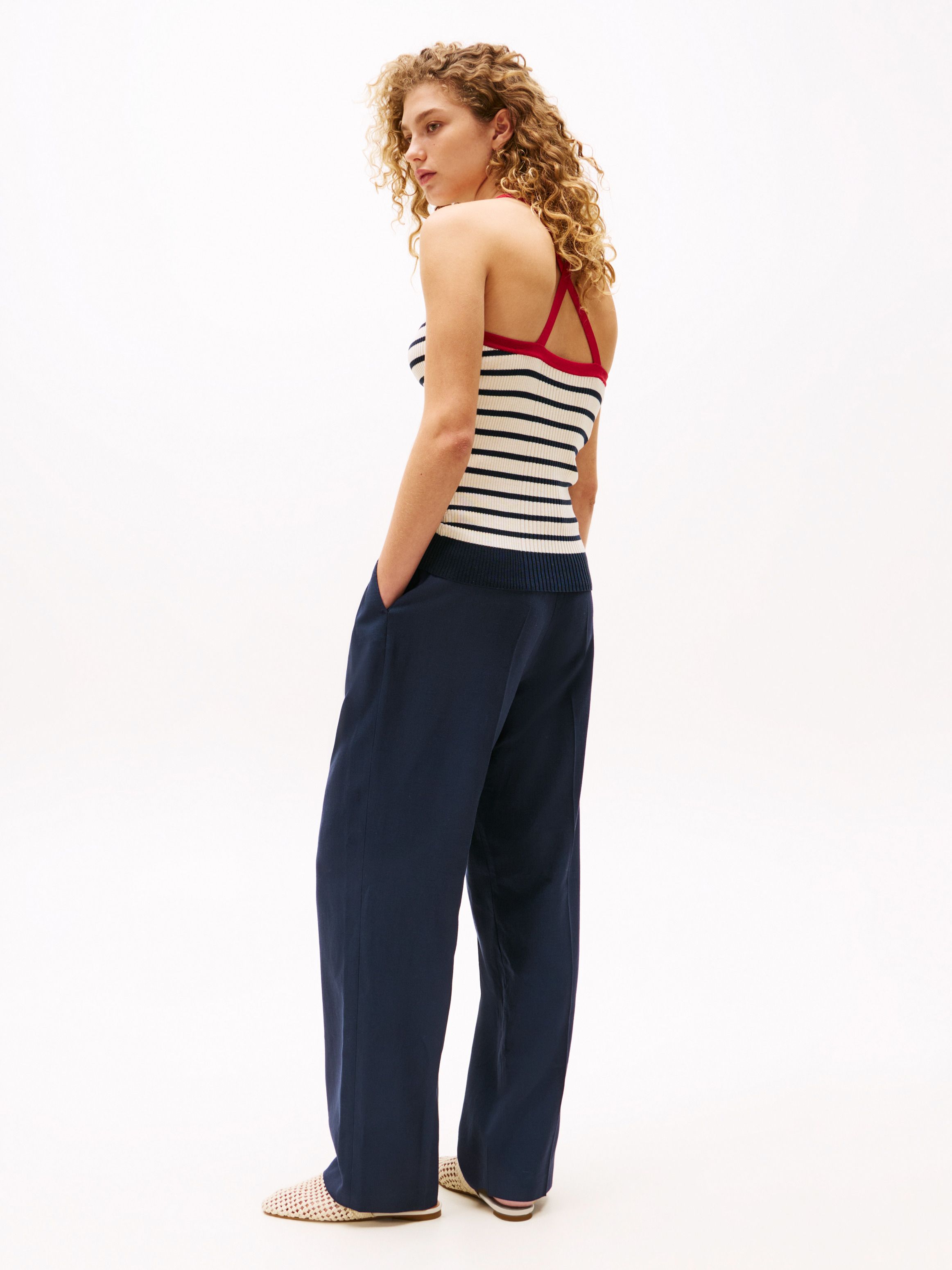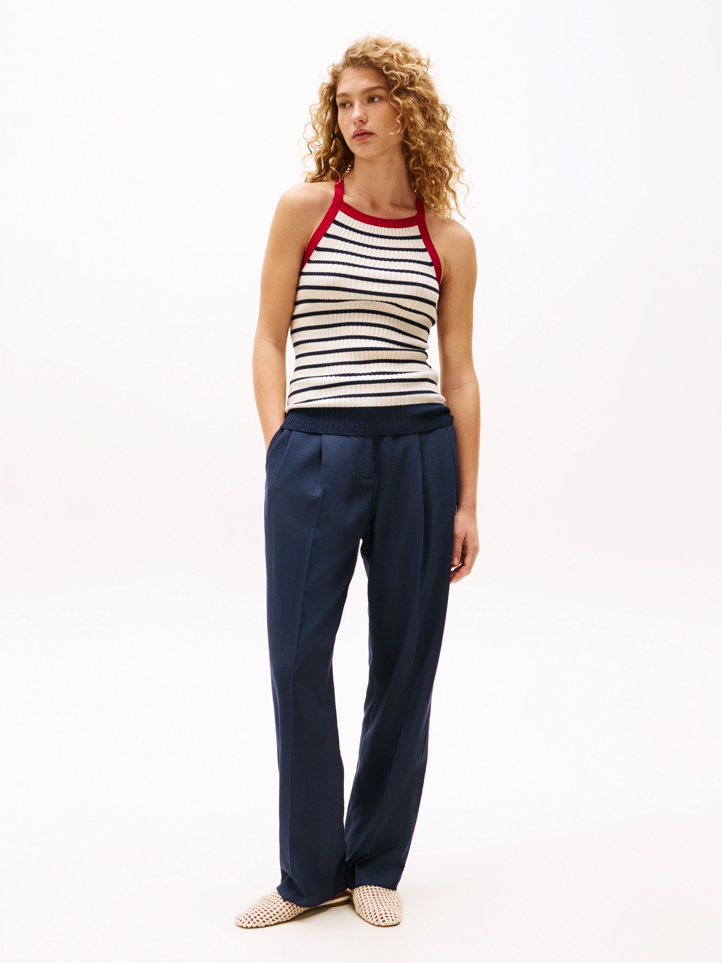 تمنحك الخطوط البحرية الجريئة والنسيج المضلع مع لمسة من الحرير لمسة عصرية مميزة، مما يجعل هذه البلوزة بدون أكمام مثالية لإضفاء لمسة حيوية على إطلالتك اليومية.