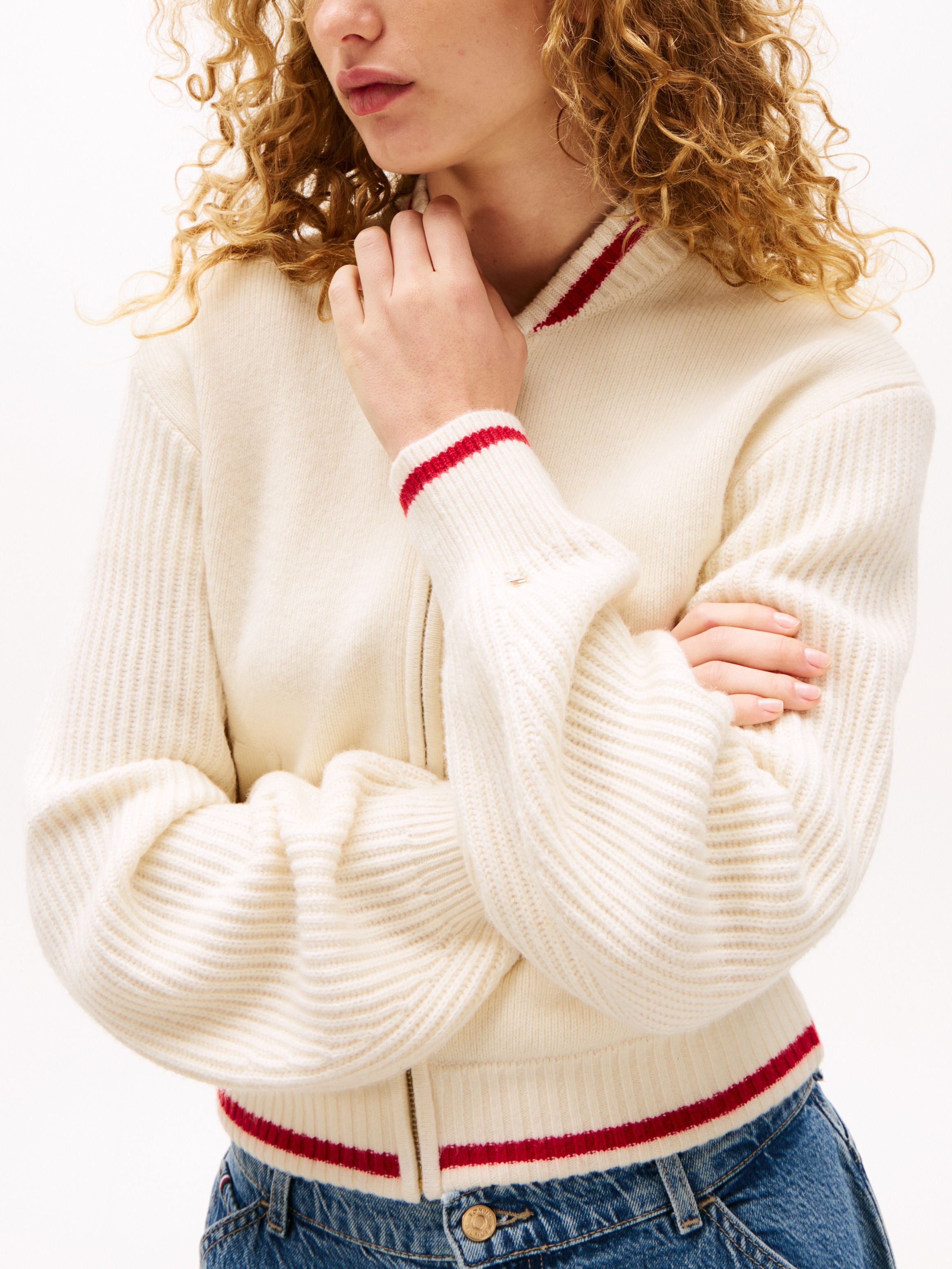 • تفاصيل مخططة على الياقة والأساور والحافة
